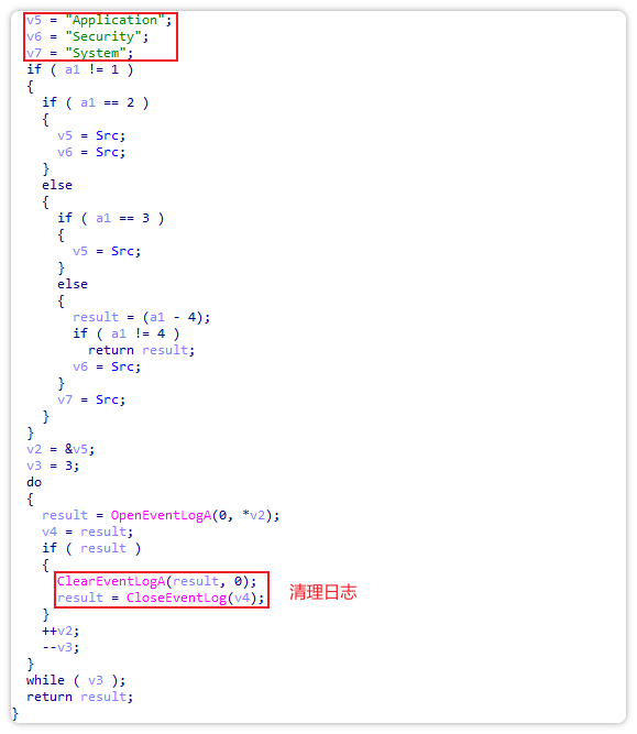 0x04清理日志:通过有针对性地删除系统中“Application”(应用程序)、“Security”(安全)及“System”(系统)这三类关键事件日志,以清理自身的攻击轨迹。