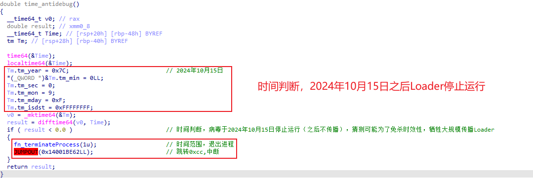 通过分析初始样本 demo.exe ,定位到恶意代码加载函数 shellcode_Exec() 。该样本采用时间判断进行退出,并通过 CMD 命令行实现延迟自我删除后,执行恶意代码的解压与运行。