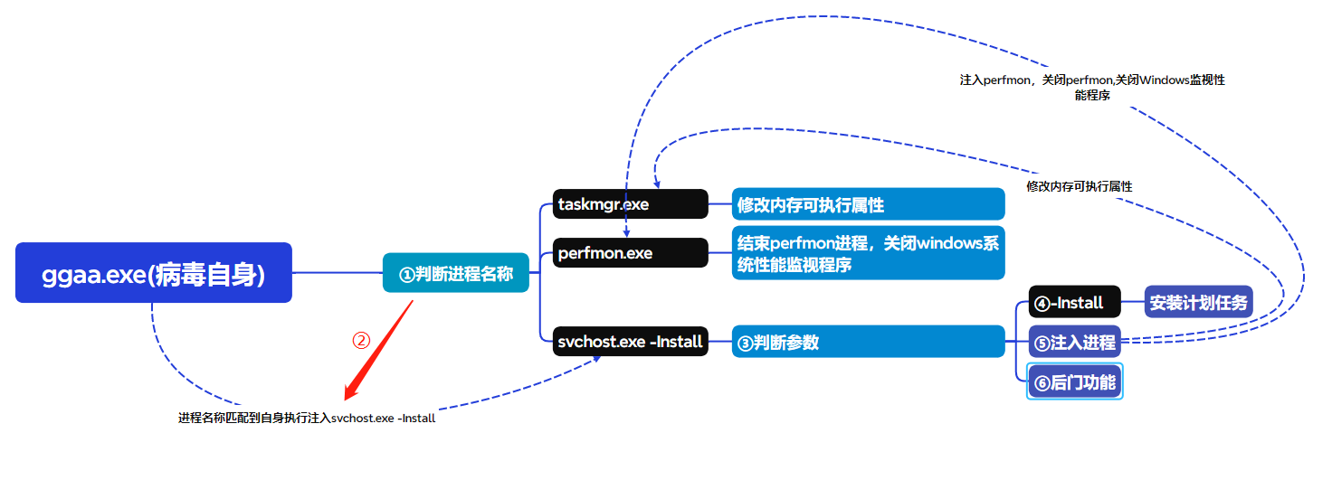 病毒会先通过 C:\\Windows\\ggaa.exe 启动,进行进程名称对比。未匹配到 taskmgr.exe、perfmon.exe 或 svchost.exe 时,开始执行注入 svchost.exe -Install 操作,并通过 svchost.exe -Install 实现安装计划任务 C:\\Windows\\ggaa.exe -svc 。