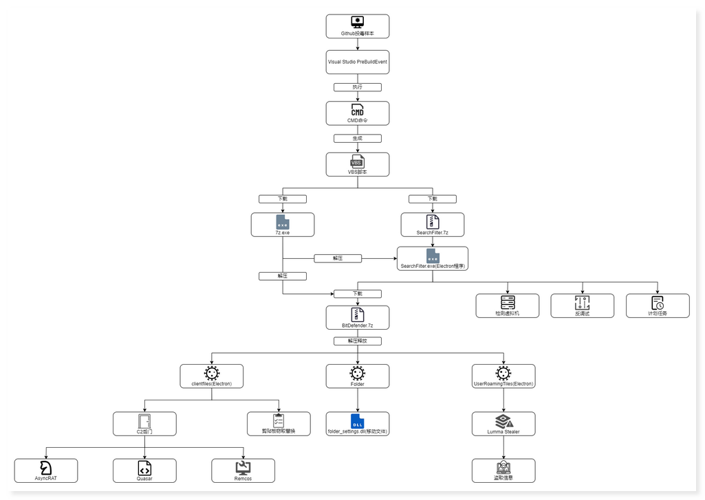 该样本通过利用Visual Studio的PreBuildEvent机制执行恶意命令,生成VBS脚本以下载7z解压工具和恶意压缩包SearchFilter.7z。解压后,样本加载一个基于Electron框架的程序,该程序具备反调试和虚拟机检测功能,能够规避安全分析环境。随后,程序从GitHub下载并解压第二个恶意压缩包BitDefender.7z,进一步释放多个恶意模块,包括后门工具(如AsyncRAT、Quasar、Remcos)、剪贴板劫持组件以及Lumma Stealer窃密木马。