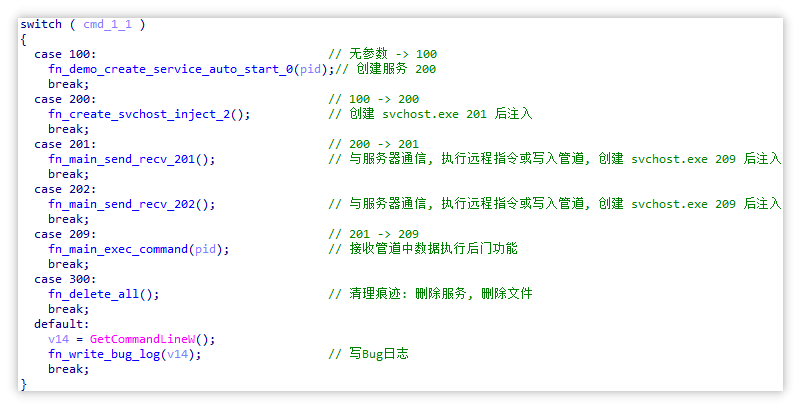 注入阶段:创建两个分别附带参数 201 与 209 的 svchost.exe 进程,并向其注入后门模块。这两个进程都具备执行后门功能的能力。其中,附带 209 的进程会通过附带 201 的进程接收远程指令,进而执行后门功能。