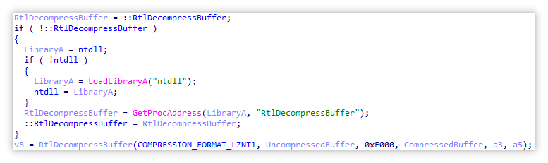通过 PEB 获取 kernel32.dll 的基址,并根据导出表查询到 GetProcAddress 地址。借助该地址获取 LoadLibraryA 、 VirtualAlloc 、 RtlDecompressBuffer 、 memcpy 等函数地址。