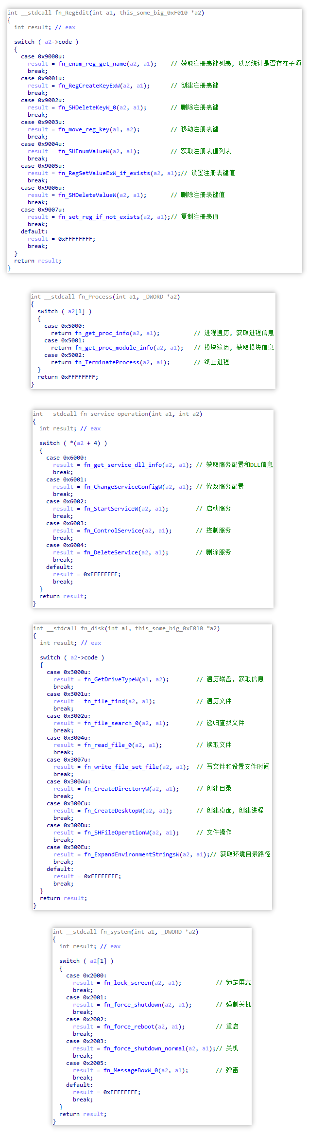 执行控制功能:随后,该进程接收指令并执行控制功能。其中控制码 3 号对应为执行后门功能。