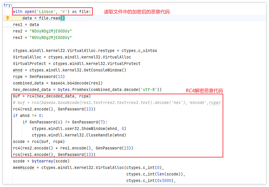 对其中的Python Loader进行分析发现,该Python Loader的核心功能是将整个Python程序打包进压缩包,并通过RC4对Linsce文件中的恶意代码Shellcode进行解密与内存加载。