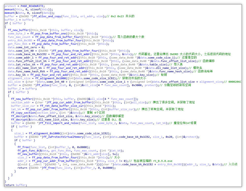 入口点基本处理:通用恶意模块入口点会进行重定位、修复 IAT、修改调用 ZwQueryInformationProcess API 地址、禁用线程通知、报错静默处理等操作。