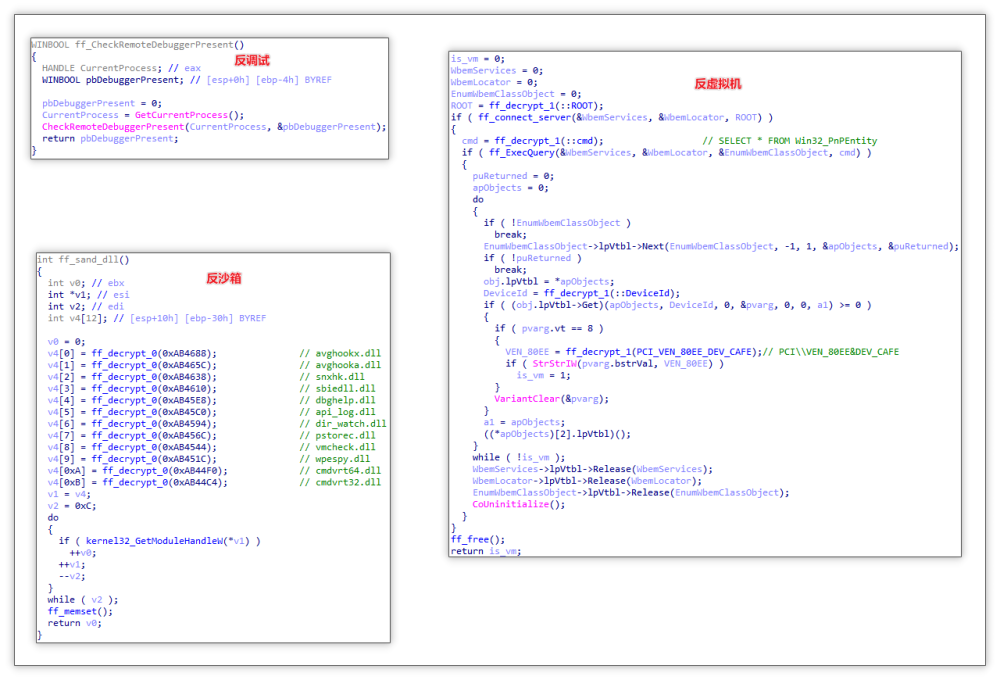 反沙箱、反调试、反虚拟机、检测分析环境等。