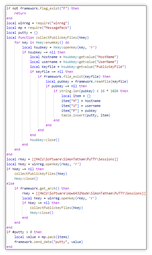 FTP/SSH 客户端窃取:窃取 PuTTY、CuteFTP、FlashFXP、SmartFTP、Total Commander 等 FTP/SSH 客户端秘钥信息,下图是 PuTTY 客户端相关秘钥的窃取脚本。