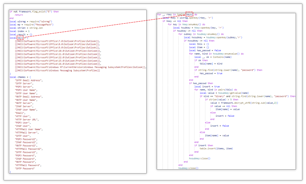邮件与通讯软件窃取:窃取 Outlook、The Bat!、eM Client、Pidgin 等软件秘钥信息,下图是 Outlook 秘钥信息的窃取脚本。